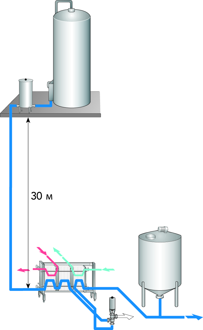 В случае падения температуры пастеризованного продукта вследствие временного дефицита нагревающей среды в состав установки должен быть включен клапан обратного потока для возврата недостаточно прогретого молока в уравнительный резервуар.