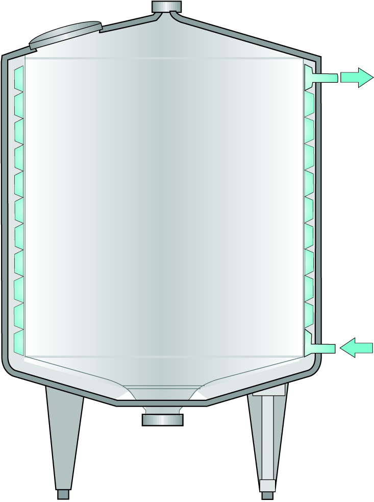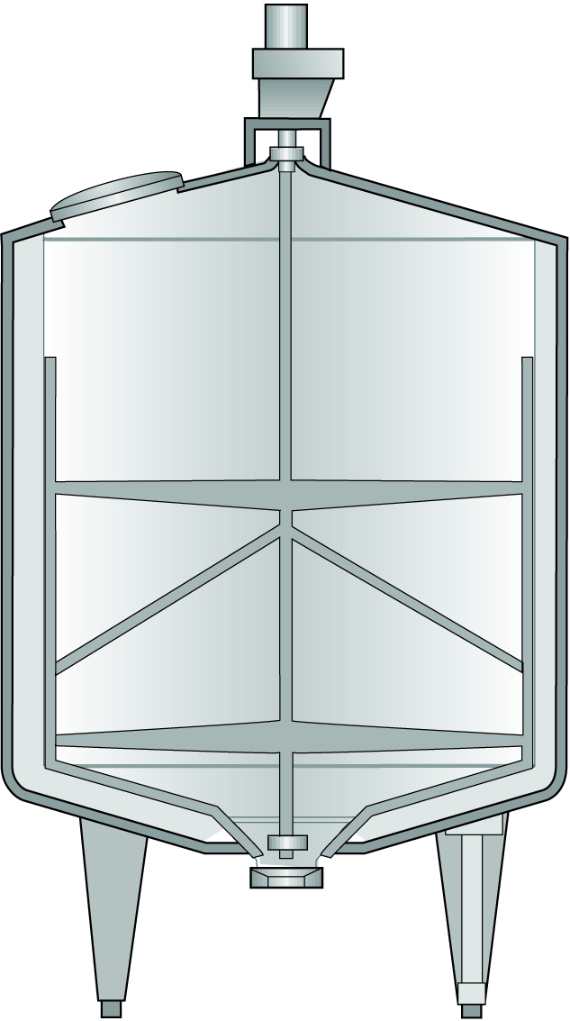 Как следует из названия, эти емкости (рис. 6.9.4) предназначены для смешивания различных продуктов или для подмешивания в продукт каких-либо ингредиентов. Эти емкости могут быть изолированными или иметь один корпус из нержавеющей стали. Они могут быть оснащены системами контроля температуры. У изолированных емкостей с минеральной ватой в пространстве между внешней и внутренней оболочками имеется кожух с внешней стороны внутренней оболочки, через который закачивается подогревающая/охлаждающая среда. Кожух состоит из приваренных каналов.
