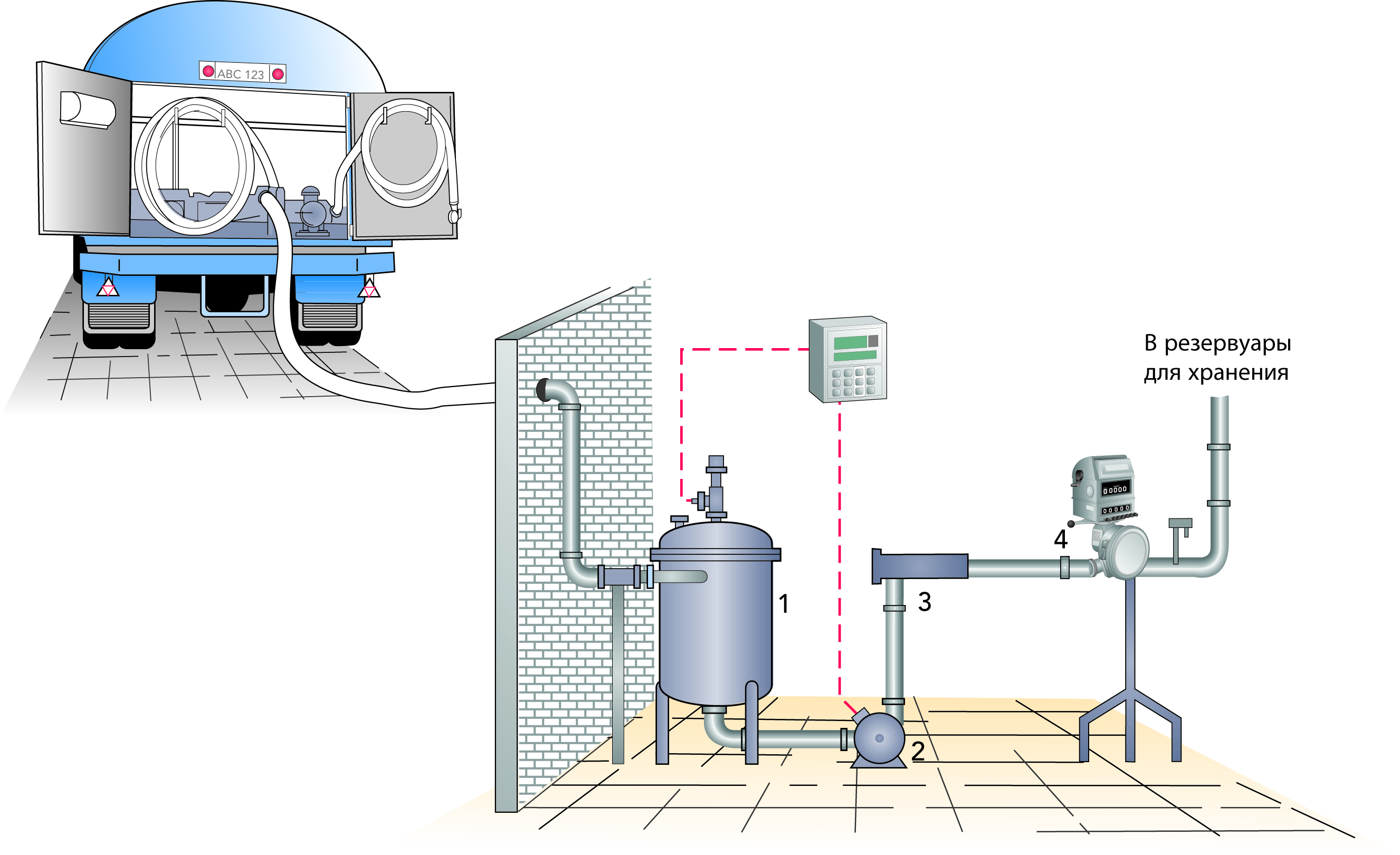 Насос запускается с панели управления, которая дает сигнал о том, что молоко в воздухоотделителе достигло необходимого уровня, чтобы предотвратить обратный подсос воздуха в линию. Насос останавливается, как только уровень молока падает ниже заданного уровня. После измерения молоко перекачивается в резервуар для хранения.