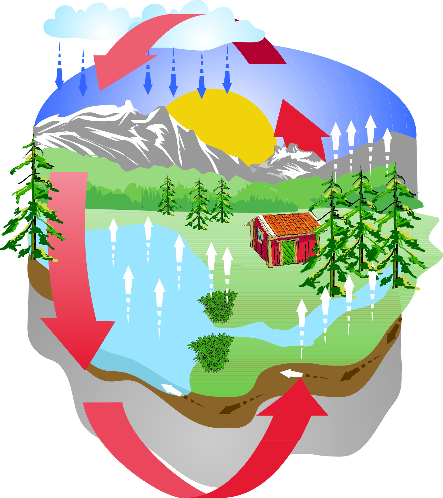 Вода в природе движется по замкнутому циклу (рис. 6.11.1). Нагреваемая солнцем, она испаряется с поверхности океанов, морей и озер. Находясь во взвешенном состоянии в воздухе, она переносится ветром над землей и постепенно охлаждается, конденсируется и выпадает на землю в виде осадков. Часть воды, поверхностные воды, попадает из земли непосредственно в реки, озера и возвращается в море. Остальная часть просачивается сквозь поверхностные слои почвы и образует грунтовые воды.