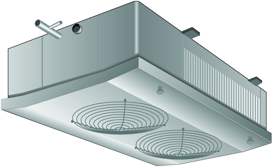 В испарителе с воздушной циркуляцией (рис. 6.11.10) воздух охлаждается, проходя через батарею труб, снабженных ребрами для максимального увеличения площади теплопередачи. Хладагент, циркулирующий по трубам, поглощает тепло из воздуха и испаряется. Испарители этого типа применяются для охлаждения складских помещений и для охлаждения воздуха в установках кондиционирования воздуха.