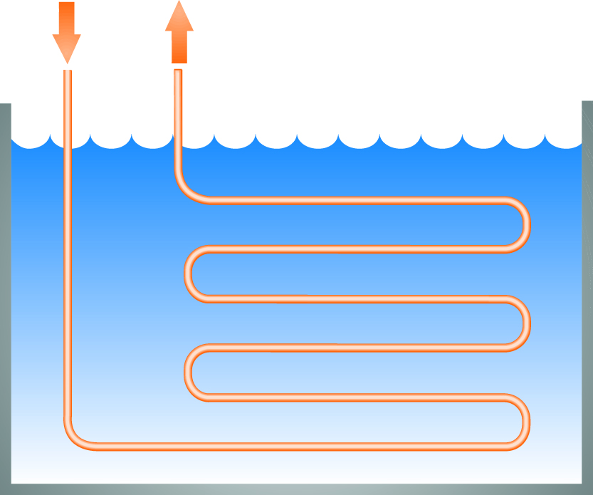 Испаритель-змеевик (на рис. 6.11.11), предназначенный для накопления льда, помещают в сосуд с водой для ее сильного охлаждения. В ночное время на трубах испарителя, по которым циркулирует хладагент, образуется слой льда. Это позволяет использовать дешевую электроэнергию для работы охладительной установки. Днем лед тает, увеличивая количество ледяной воды и производительность охладительной установки.