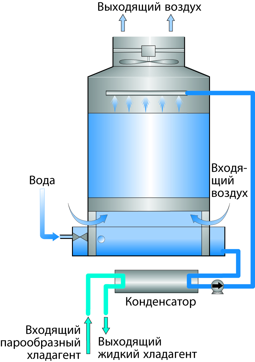 Испарительный конденсатор представляет собой объединение конденсатора воздушного охлаждения с градирней. К такому варианту прибегают при недостатке или в случае высокой стоимости охлаждающей воды.