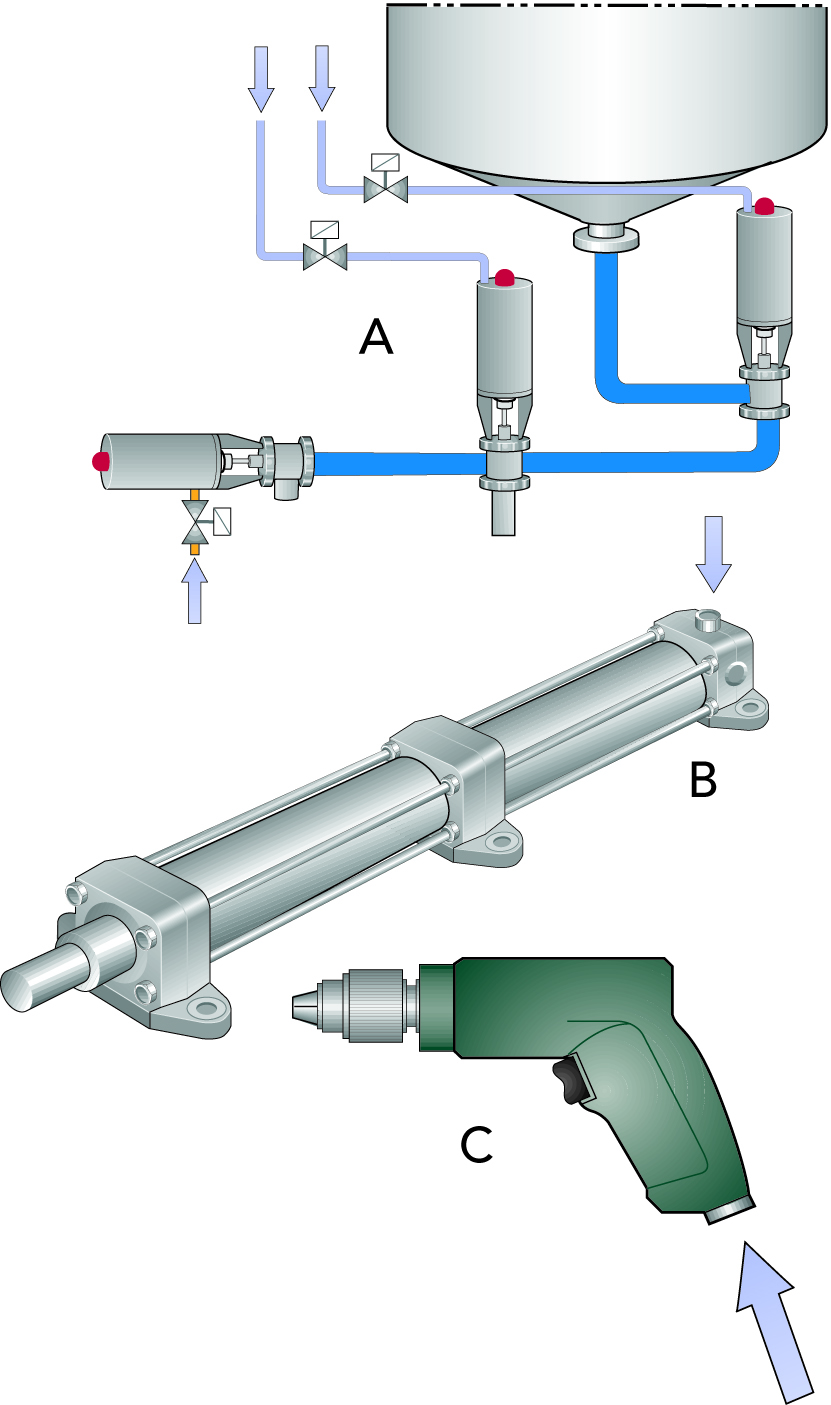 Наибольшие количества сжатого воздуха используются в пневматических механизмах на молочном заводе и в мастерских. Воздух должен поступать под давлением около 600 кПа (6 бар), для чего необходим компрессор, развивающий рабочее давление 700 кПа (7 бар), для компенсации потерь давления в системе распределения. Необходимы лишь небольшие количества сжатого воздуха более низкого давления, чем в системах управления приборами и силовых системах. Следовательно, было бы неэкономично держать для производства этого воздуха специальный компрессор, которому, к тому же, потребовалась бы и отдельная система воздухопроводов. Поэтому сжатый воздух для всех систем вырабатывается одним центральным компрессором и уже затем проходит индивидуальную обработку в соответствии с конкретным назначением.