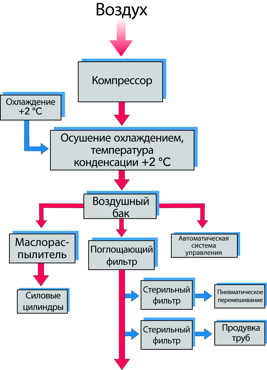 Сжатый воздух высочайшего качества, который непосредственно соприкасается с продукцией при ее пневматическом перемешивании в танках и при вытеснении ее из трубопроводов, подвергается дополнительной сушке в абсорбционных фильтрах, а затем стерилизуется в специальных фильтрах перед использованием.