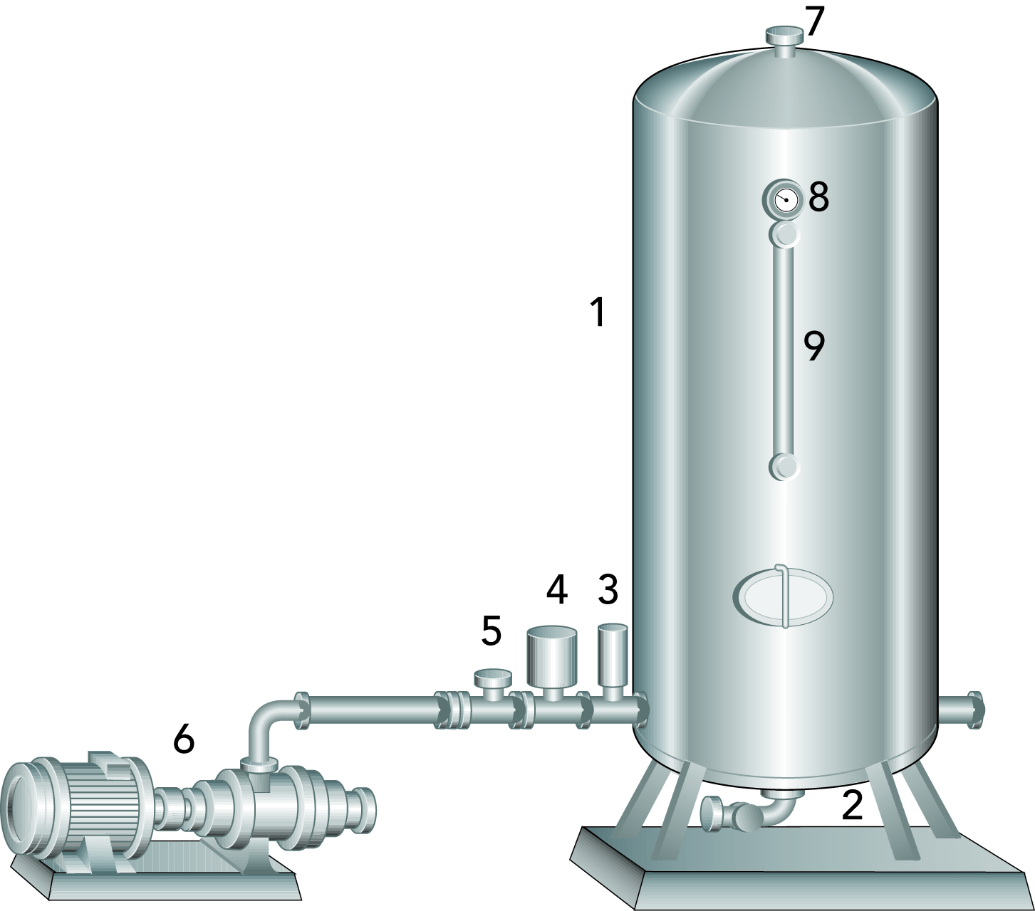 Например, молокозавод может увеличить выпуск продукции без соответствующего увеличения водоснабжения. Если это произойдет иодновременно возникнет несколько внезапных нагрузок, подаваемое давление в нагнетающей системе упадет до опасно низкого уровня, нарушая правильную работу определенногооборудования. Для предотвращенияэтогоможно использовать водонапорный бак. Водонапорный резервуар играет роль аккумулятора. Его типовой объем – в пределах 1–3 м3. Вода в нем держится под давлением, определяемым воздушной подушкой. При необходимости водонапорный бак снабжает оборудование необходимым количеством воды под необходимым давлением. После того как пиковый спрос удовлетворен, бак снова наполняется до следующего забора воды. На рис. 6.11.3 показан водонапорный бак такого типа. Когда вода не нужна, резервуар наполняется водой до установленного уровня давления. Датчик давления (4) отключает подачу электроэнергии к насосу (6). Как только вода удаляется избака, возникающее падение давления немедленно фиксируется датчиком давления, который через пускатель включает насос, подающий воду в бак. Как только забор прекращается, уровень воды в резервуаре начинает расти, пока не будет достигнуто заданное значение. После этого реле давления останавливает насос, и резервуар готов к удовлетворению следующего кратковременного спроса.