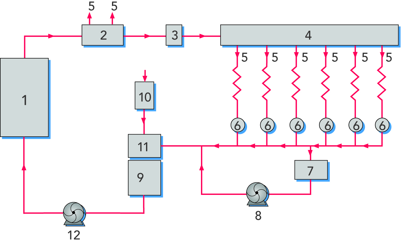 Производство молочных продуктов требует большого количества тепловой энергии для подогрева различных продуктов, моющих растворов и т. д. Тепло обычно передается продукту в теплообменниках с помощью теплоносителя, также называемого нагревательной средой. Этасреда создаетсявтепловой установкеираспространяется потрубопроводам среди различных потребителей (таких как теплообменник в блоке подогрева воды пастеризатора). Там тепло передается нагреваемому продукту. Затем теплоноситель возвращается в нагревательную установку, где он снова подогревается, передтем как опять направиться к участкам потребления энергии. Это замкнутый непрерывный цикл.