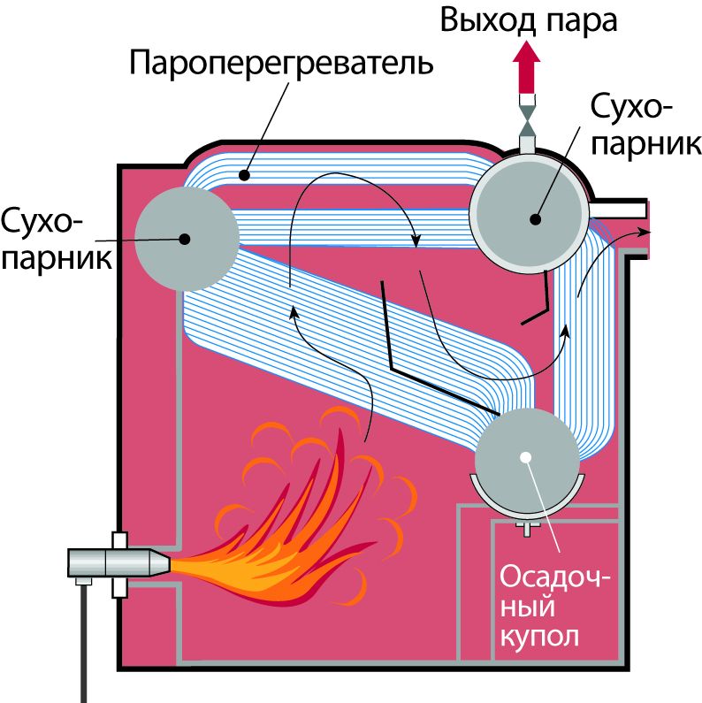 Когда давление в сухопарнике достигает требуемого (заданного) уровня, открывается паровой клапан и пар направляется к местам потребления. Горелка включается и выключается автоматически, поддерживая постоянное давление пара. Питательная вода добавляется в котел по мере необходимости для поддержания ее постоянного уровня. При превышении максимально допустимого давления пара в сухопарнике открывается предохранительный клапан.
