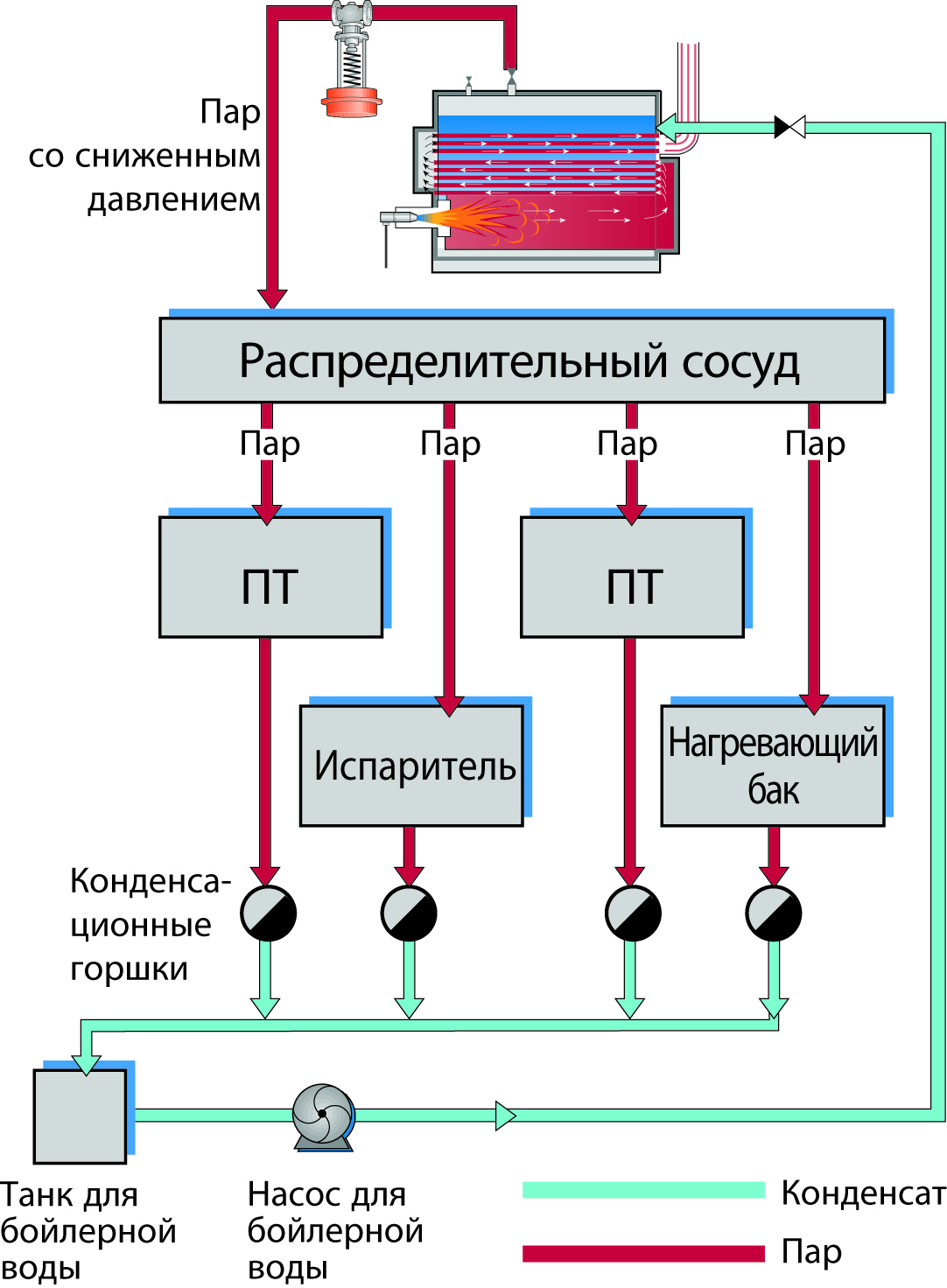 Сконденсировавшийся пар (конденсат) собирается в конденсатоотводчик (6) и в конденсатный бак (7), откуда перекачивается обратно в бойлер насосом для конденсата.