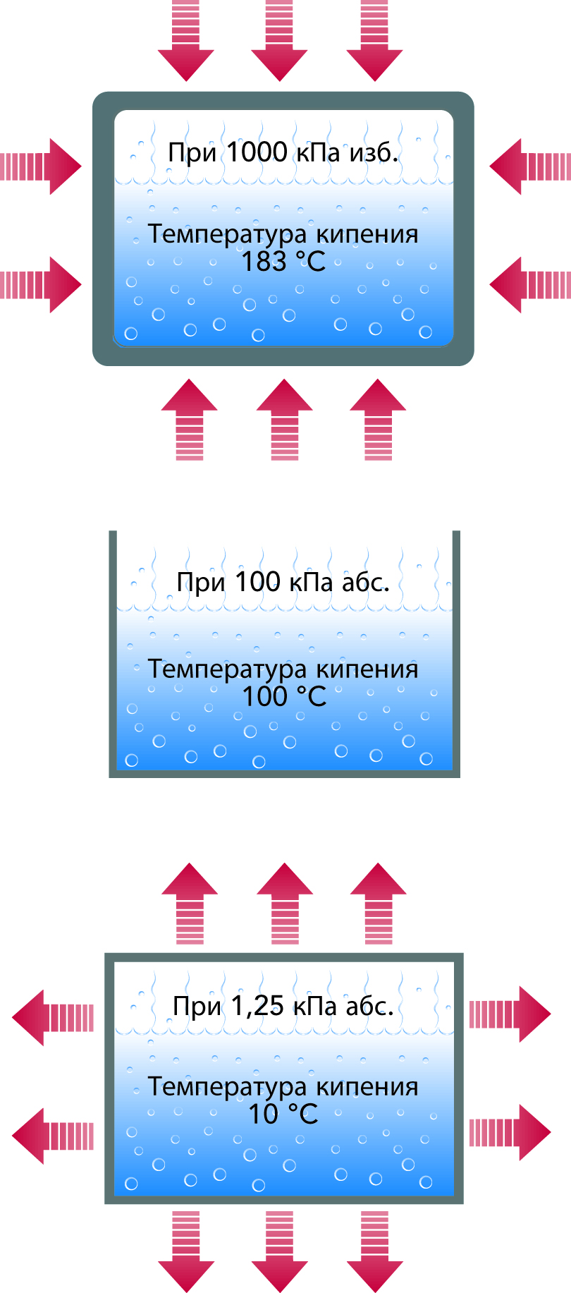 И наоборот, если давление понижено, вода закипает при более низкой температуре. При атмосферном давлении вода кипит при 100 °С (рис. 6.11.8 В). Если давление ниже атмосферного, создается вакуум и вода кипит при температуре ниже 100 °С. Подключив вакуумный насос к сосуду с водой и снизив абсолютное давление до 50 кПа (0,5 бара), можно заставить воду кипеть при 80 °С. А если давление снизить до 1,25 кПа (0,0125 бара), вода закипит при 10 °С (рис. 6.11.8 С).