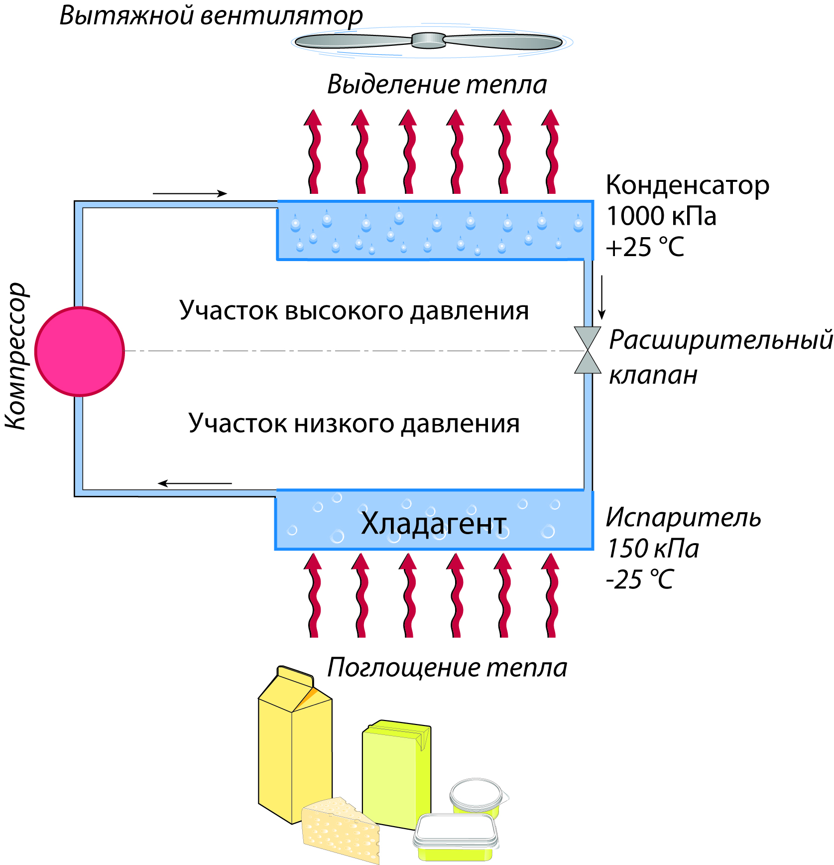 Большое число этапов процесса производства требует,чтобы продукт был нагрет до определенной температуры. Любое повышение температуры обычно приводит к активизации микроорганизмов, которые могут присутствовать в продукте, а также к ускорению химических реакций, контролируемых ферментами.Такой активности нужно всячески избегать, поэтому важно, чтобы температура продукта снижалась как можно быстрее по завершении соответствующего этапа технологического процесса. Следовательно, на молочных заводах потребность в охлаждении достаточно велика, при этом эксплуатационные расходы на холодильное оборудование составляют заметную статью бюджета предприятия.